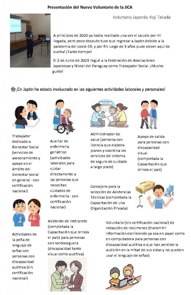 Me llamo Koji Takada y he llegado desde la ciudad de Sapporo de la prefectura de Hokkaido. Fui asignado a la Federación de Asociaciones Japonesas en el Paraguay desde el mes de febrero.