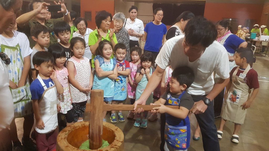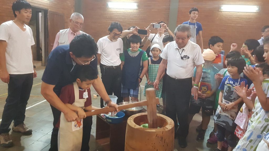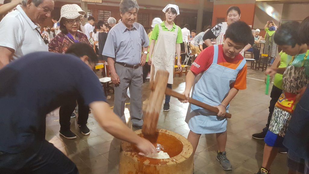 Y con el asesoramiento del adulto los alumnos experimentaron el Mochitsuki por turno seguidos con los aplausos de sus compañeros y de los espectadores.