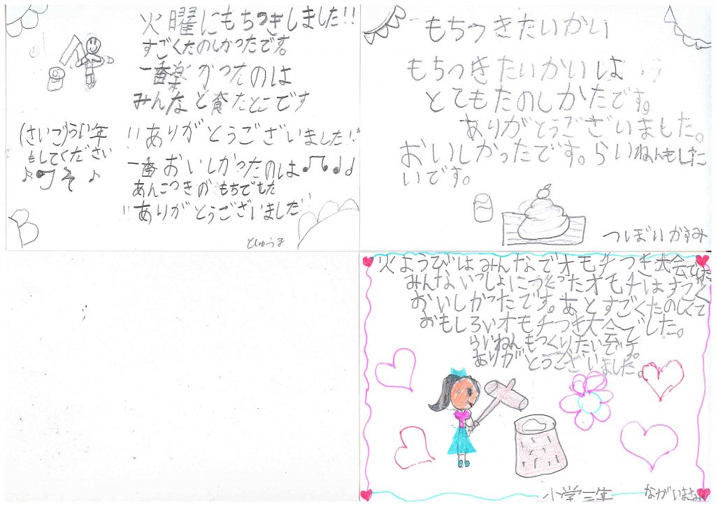 Hubieron aplausos con gritos para alentar. Se recibió de los/as estudiantes, comentarios como: “el kine pesaba más de lo que me imaginaba por pegarse al mochi”, “me dio pena no poder machacar bien, así que, espero tener otra fiesta de Mochitsuki el próximo año también”, etc.