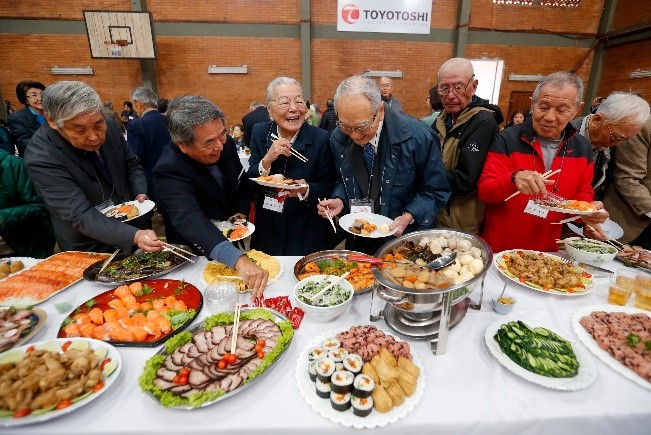 El almuerzo de intercambio comenzó con un brindis dirigido por el Cónsul Hashimoto de la Embajada del Japón en Paraguay. El momento más esperado por los participantes fue el almuerzo de intercambio, durante el cual se sirvieron una variedad de platos preparados con esmero por parte de las integrantes de la Asociación de Damas Japonesas de Asunción, por el Grupo Yu-Ai. de sashimi y postres Los presentes expresaron su alegría con voces llenas de entusiasmo. La recepción estuvo a cargo de los funcionarios de la Asociación Japonesa y los miembros de la asociación de jóvenes, quienes se aseguraron de la atención de los invitados, circulando varias veces para asegurarse de que no faltara nada.